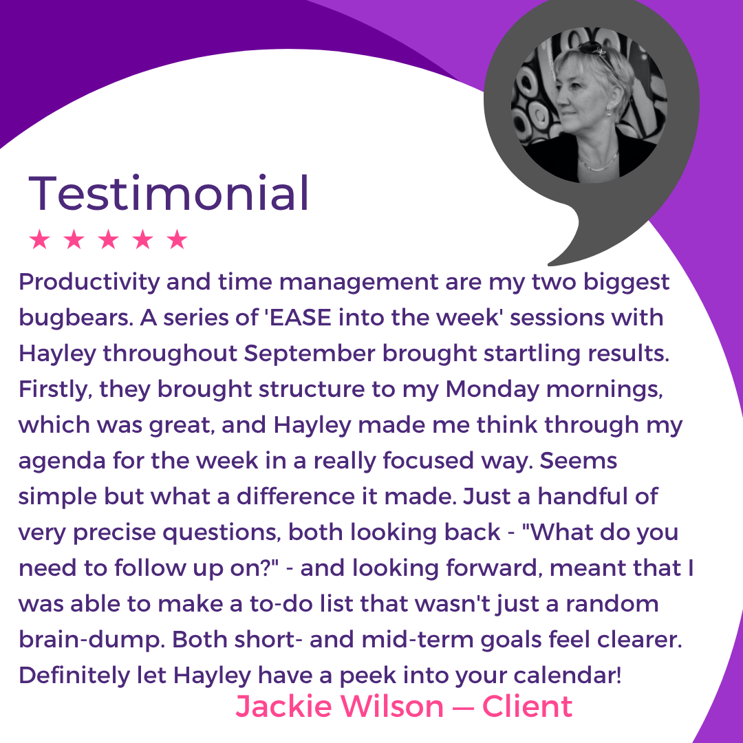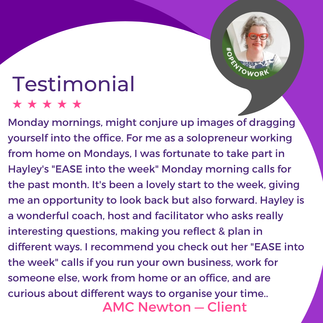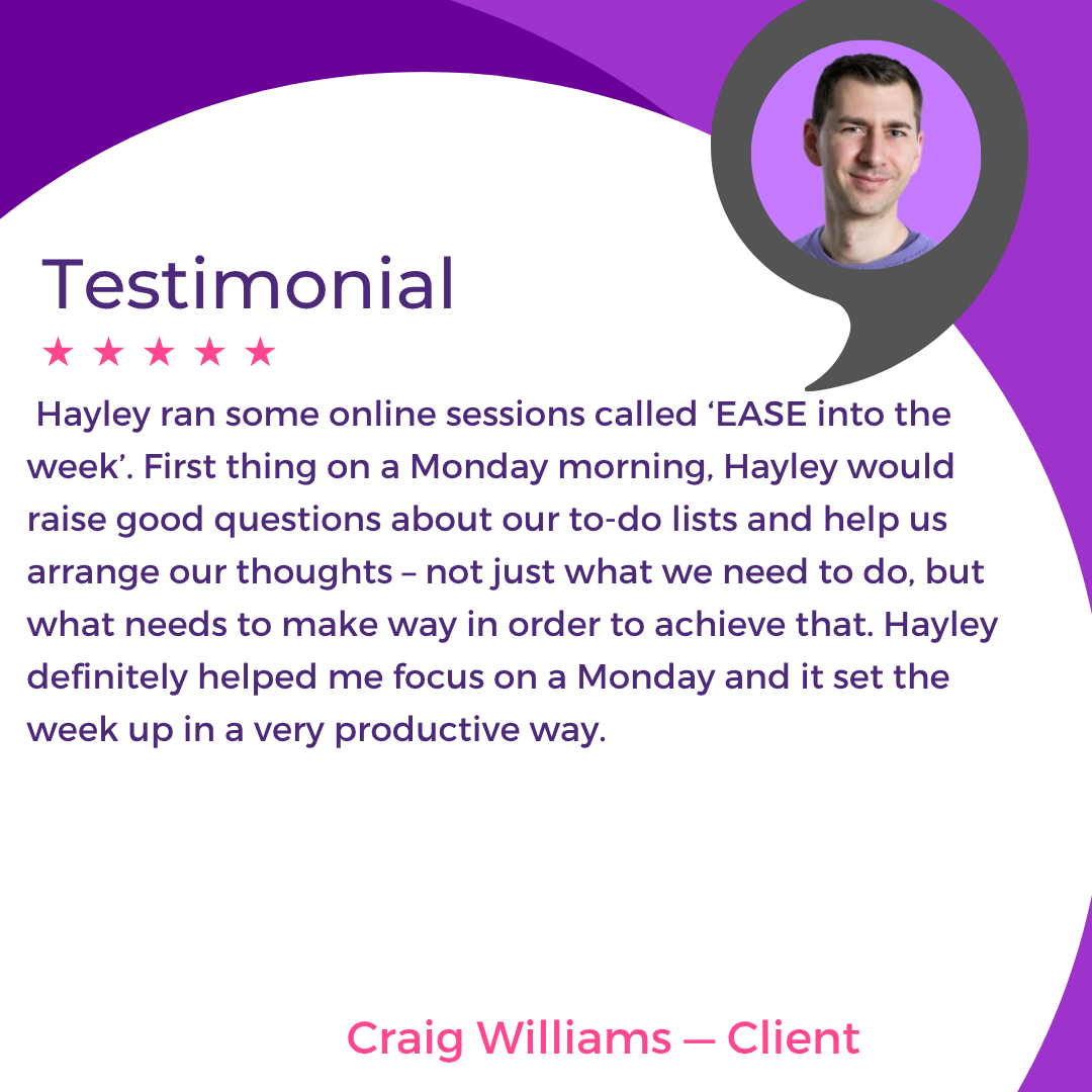 Why? Spending a bit of time each week away from doing the work helps us to feel less overwhelmed and stressed. It also means that you are really clear about your priorities for the week ahead. We may have good intentions about doing this ourselves, but often we are too busy! Meeting same time, same place each week helps get you in the habit. I provide the direction to get you focused for the week, we use my EASE framework to help you learn from last week and stop feeling overwhelmed about this week .